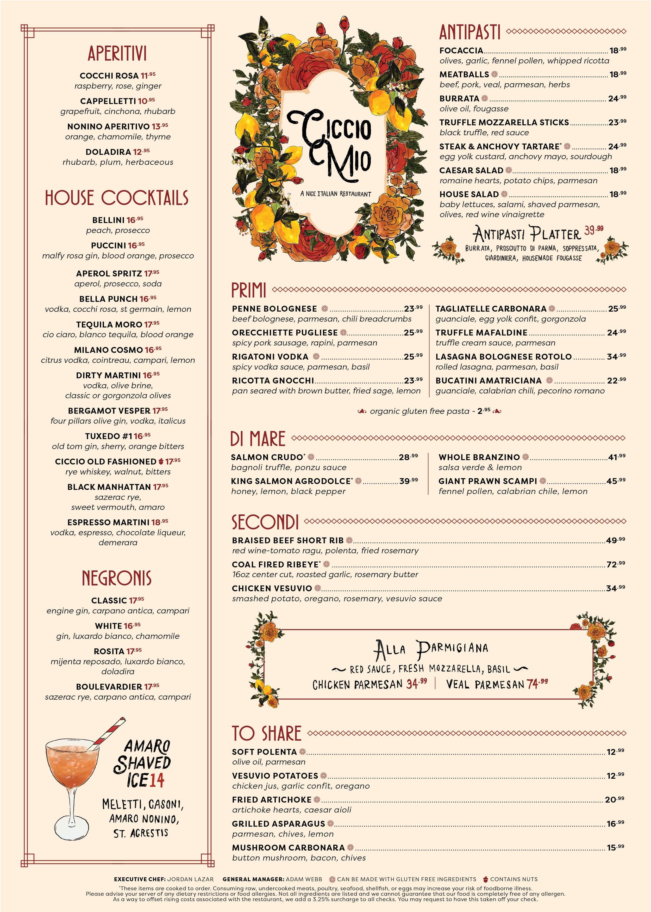Please advise your server of any dietary restrictions or food allergies. Not all ingredients are listed and we cannot guarantee that our food is completely free of any allergen. As a way to offset rising costs associated with the restaurant, we add a 3.25% surcharge to all checks. You may request to have this taken off your check.